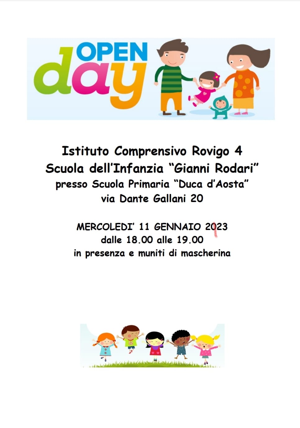 Si invitano i genitori dei bambini che l'anno prossimo dovranno iscriversi alla scuola dell'Infanzia all'open day presso la scuola "G. Rodari", che si terrà mercoledì 11 gennaio 2023, dalle ore 18:00 alle ore 19:00, presso la scuola dell'Infanzia "Gianni Rodari", in Via Dante Gallani, 20 - Rovigo