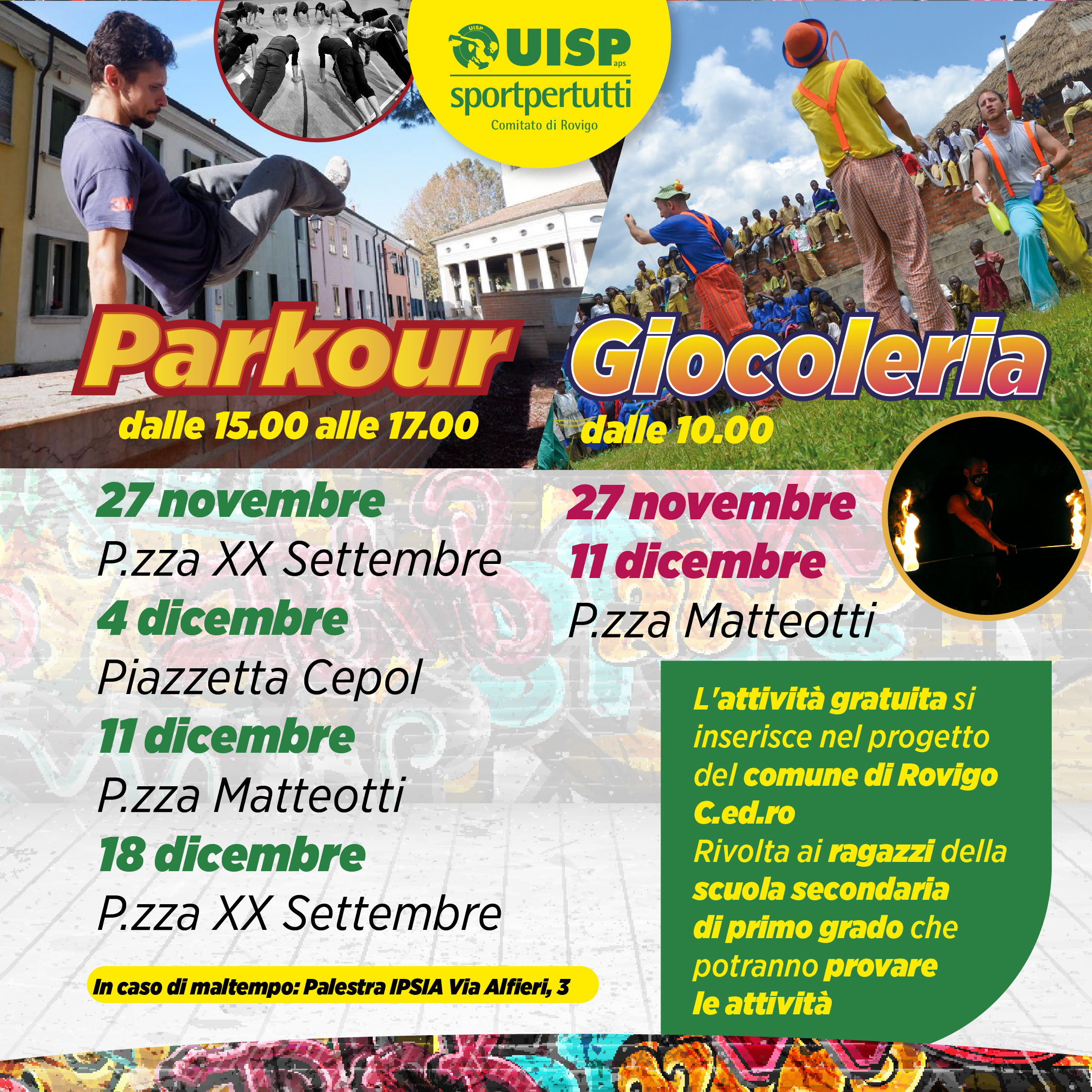 Dal 27 novembre al 18 dicembre 2021, nelle principali piazze di Rovigo, i ragazzi e le ragazze della scuola secondaria di primo grado potranno provare le attività di PARKOUR e GIOCOLERIA.