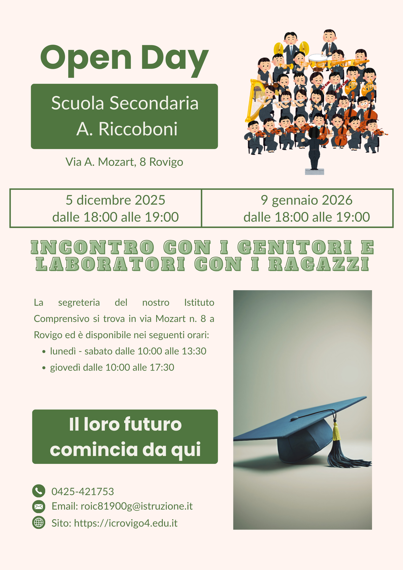 - venerdì 5 dicembre 2025 – (laboratori e incontro con i genitori) dalle 18.00 alle ore 19.00 presso la scuola secondaria di primo grado “A. Riccoboni” di Rovigo; LOCANDINA RICCOBONI