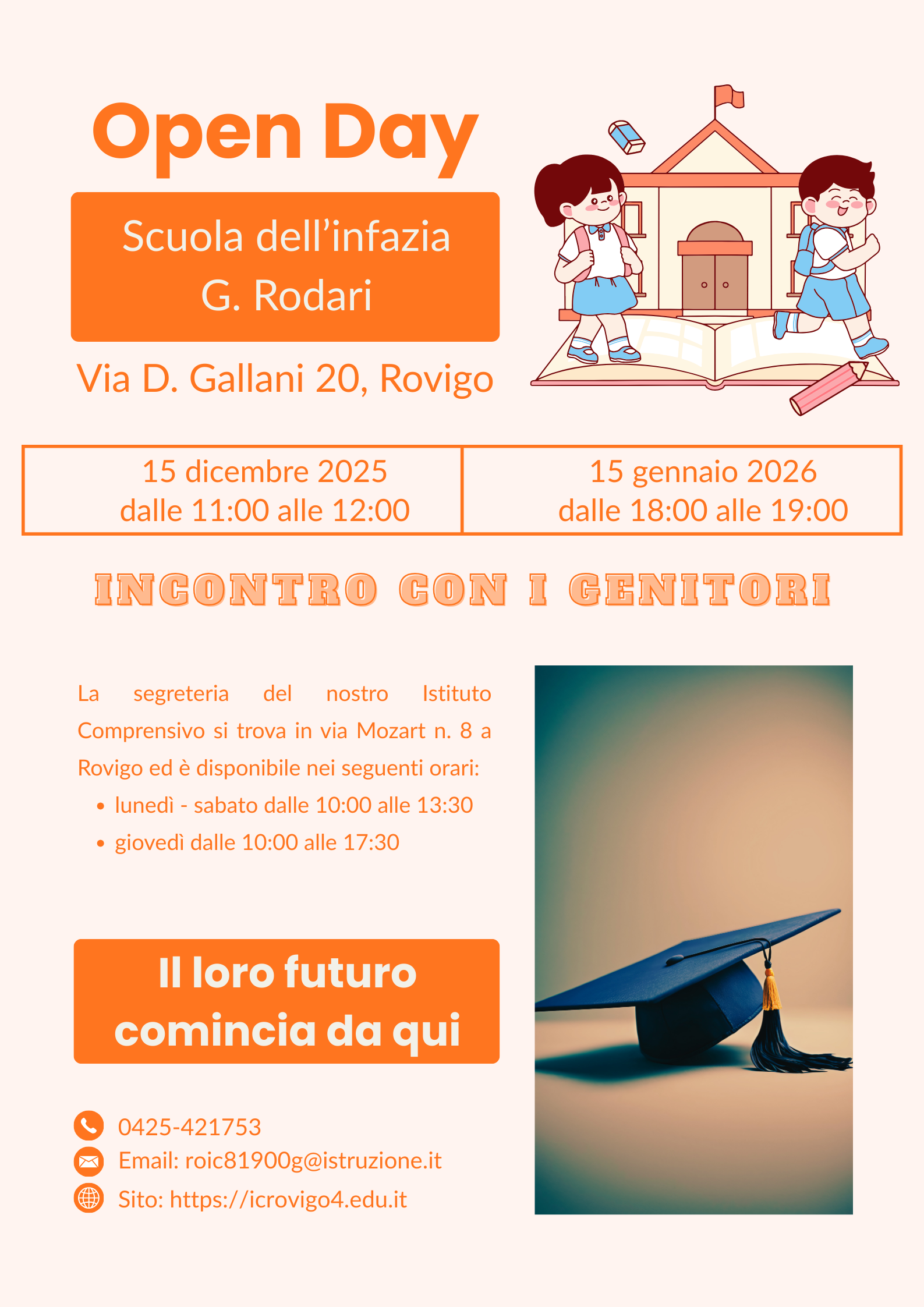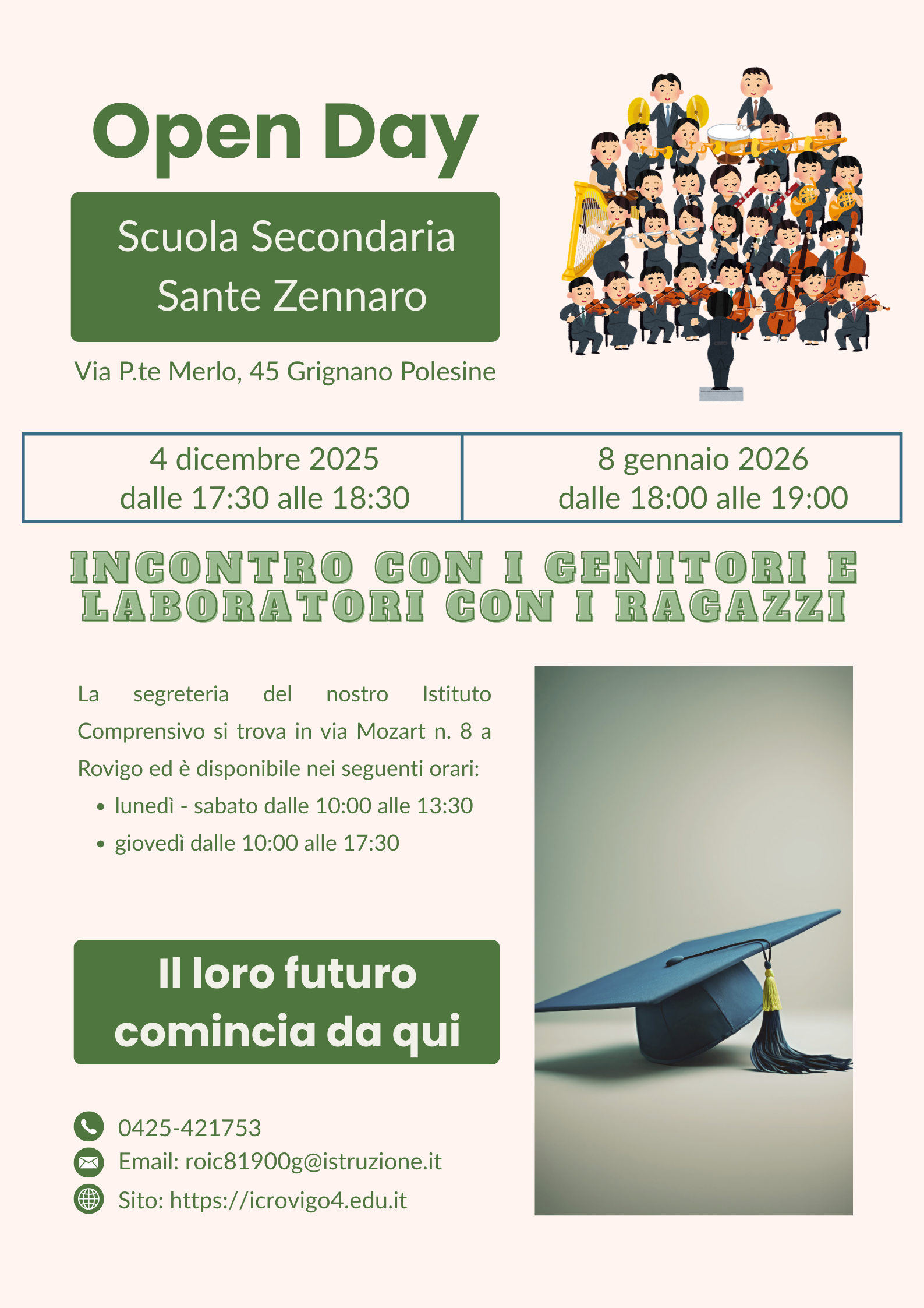 - giovedì 4 dicembre 2025 – (laboratori e incontro con i genitori) dalle 17.30 alle 18.30 presso la scuola secondaria di primo grado “S. Zennaro” di Grignano Polesine; LOCANDINA ZENNARO