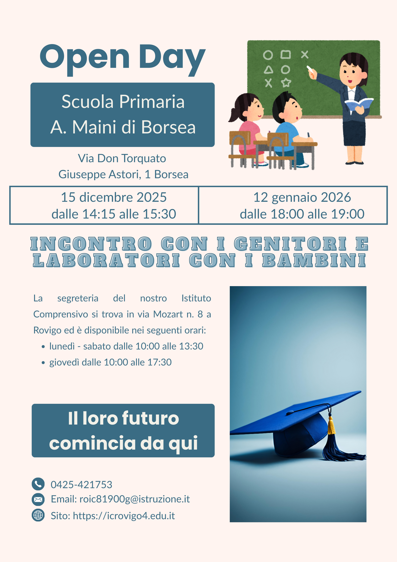 - lunedì 15 dicembre 2025- (laboratori e incontro con i genitori) dalle 14.15 alle 15.3 presso la scuola primaria “A. Maini” di Borsea; LOCANDINA MAINI