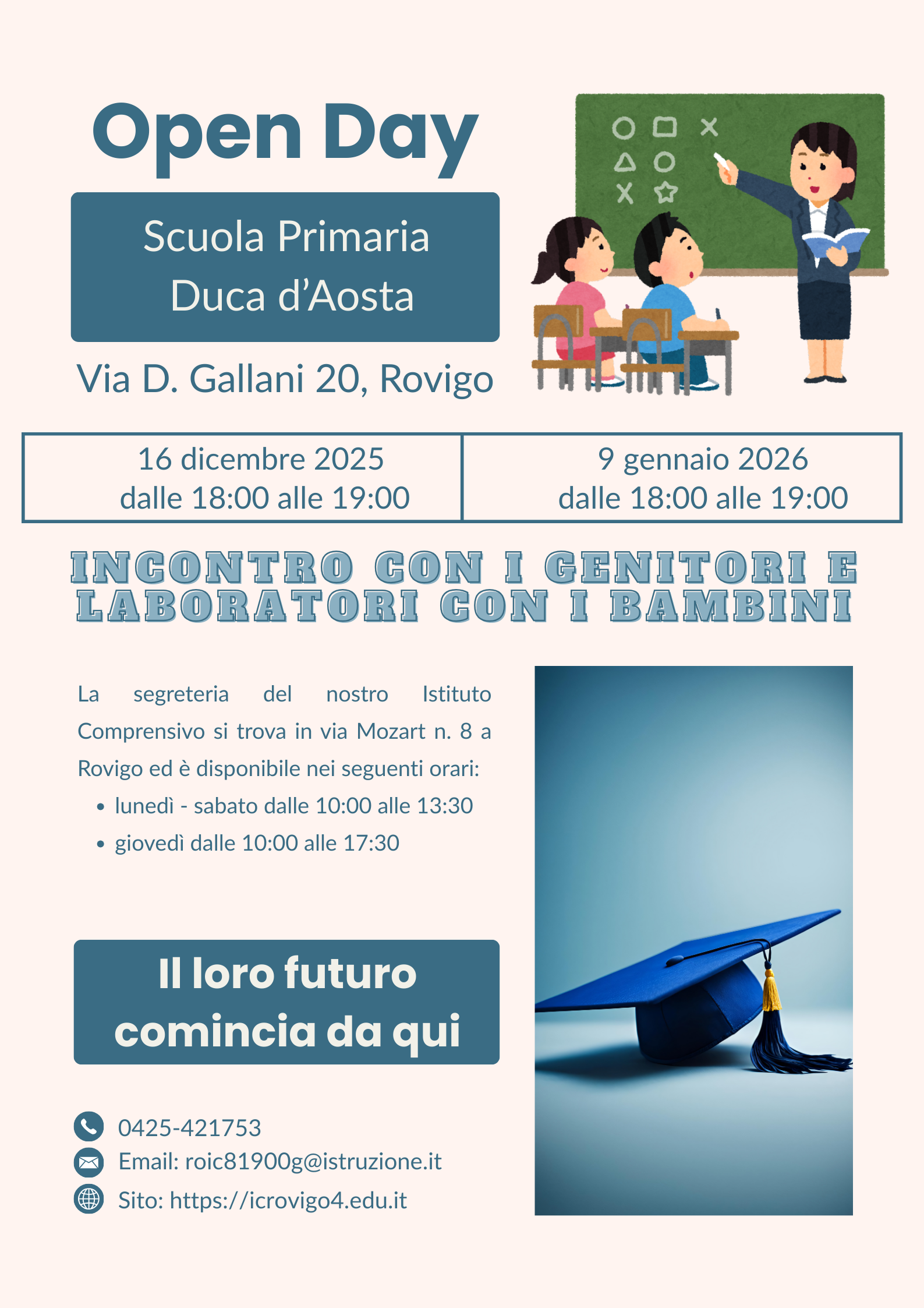 - martedì 16 dicembre 2025 - (laboratori e incontro con i genitori) dalle 18:00 alle 19:00 presso la scuola primaria “Duca d’Aosta” di Rovigo”; LOCANDINA DUCA